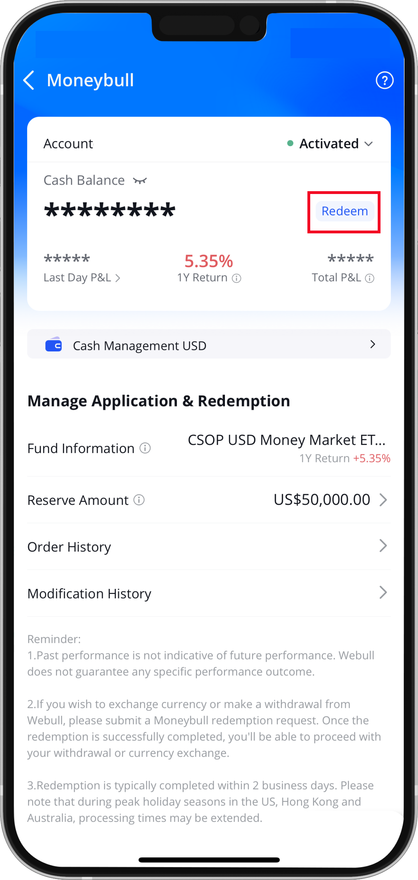 *Auto-redeemed means that when you lack sufficient cash to settle your trades, the system will automatically redeem or sell some or all of your Cash Management position to generate the necessary funds to cover the trade settlement. This process helps ensure that you have enough funds to meet your financial obligations within the trading system.