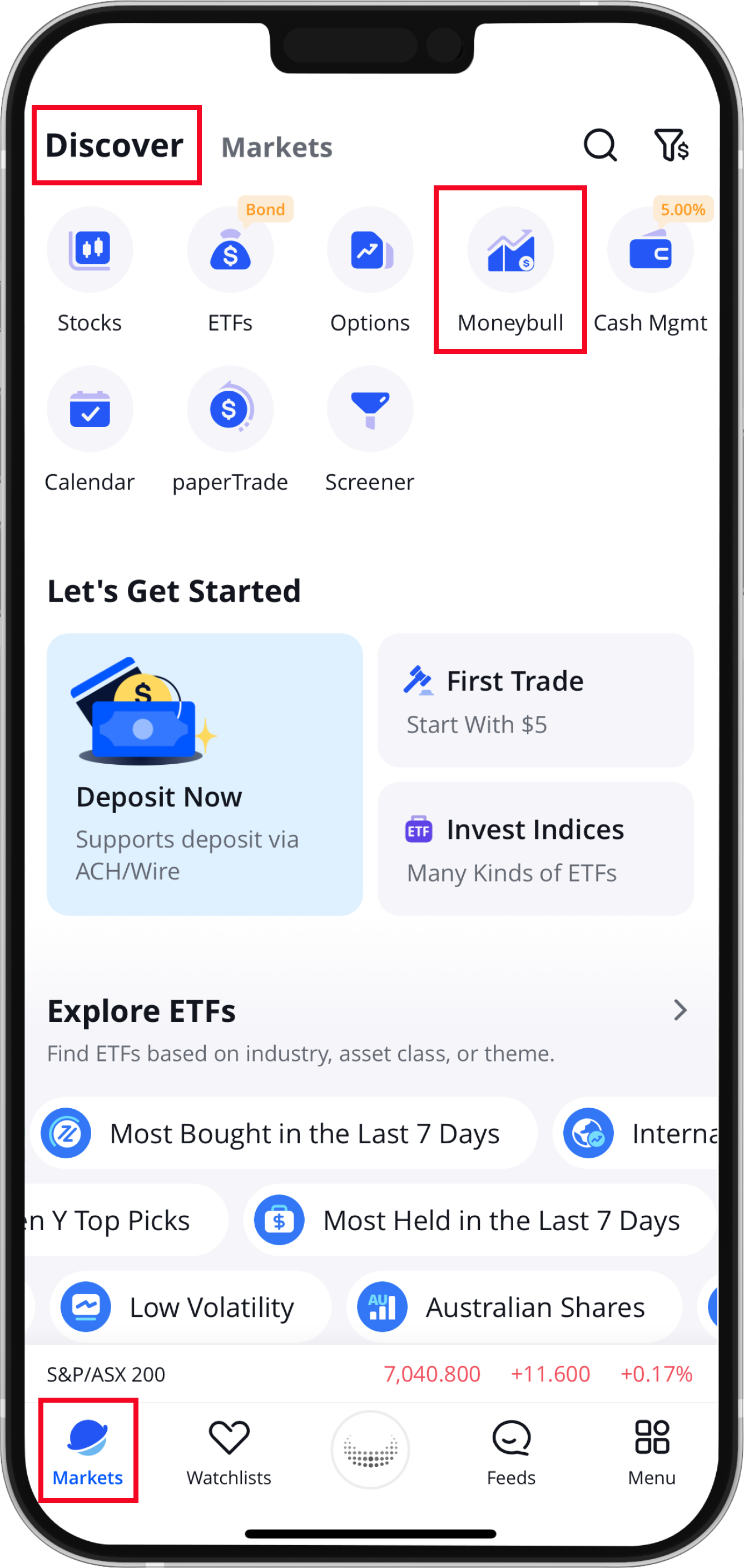 Entrance 1. Update your Webull app to version 9.2.6 and head to Markets > Discover > Cash Management Icon